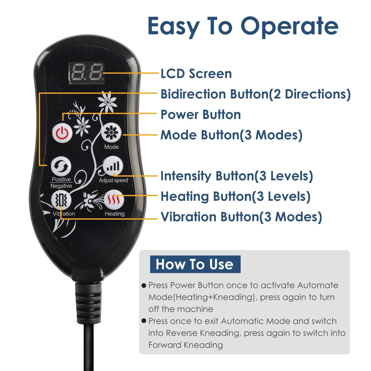 - *3 Massage Modes, 3 Intensity Levels, 3 Vibration Modes